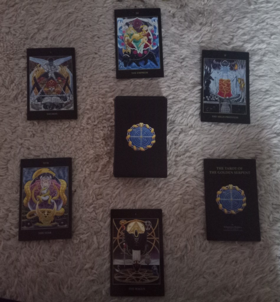 There’s no booklet included, but general information for the attributed meanings of cards is easily found + the images really are expressive. In the first spread I did for example (see below), one of the cards was the 3 of Swords. Having used the Crowley tarot for years, I know that this card represents sorrow. But even if I hadn’t known that, a glance at the symbols used leaves no room for doubt. The sad mask of the angel, the grimoire opened on a page that shows the seal of Saturn, the skull, the swords arranged in the form of a triangle.